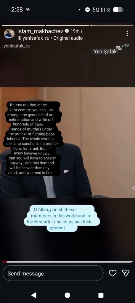 Sobre el video aparecía texto crítico con Israel, y Makhachev añadió un comentario personal de tono religioso:
