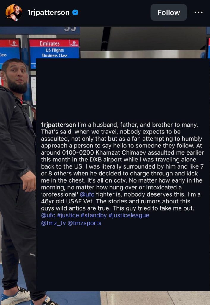 El peleador de UFC Khamzat Chimaev vuelve a estar en el centro de la polémica tras una acusación pública realizada en redes sociales por el usuario verificado “1rjpatterson”, quien asegura haber sido agredido por el luchador en el aeropuerto internacional de Dubái (DXB).