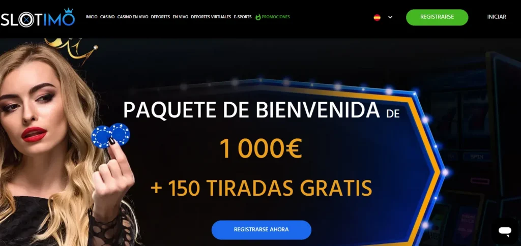 Slotimo aparece en versiones locales distintas y eso afecta tanto al idioma como a los pagos. En resultados públicos de marzo de 2026, el operador promociona hasta 1.000€ y 150 giros. Lo interesante es que algunas variantes muestran PayPal junto a métodos bancarios. Eso acerca la experiencia a un ewallet casino, aunque la ficha de pagos no siempre es igual según país.